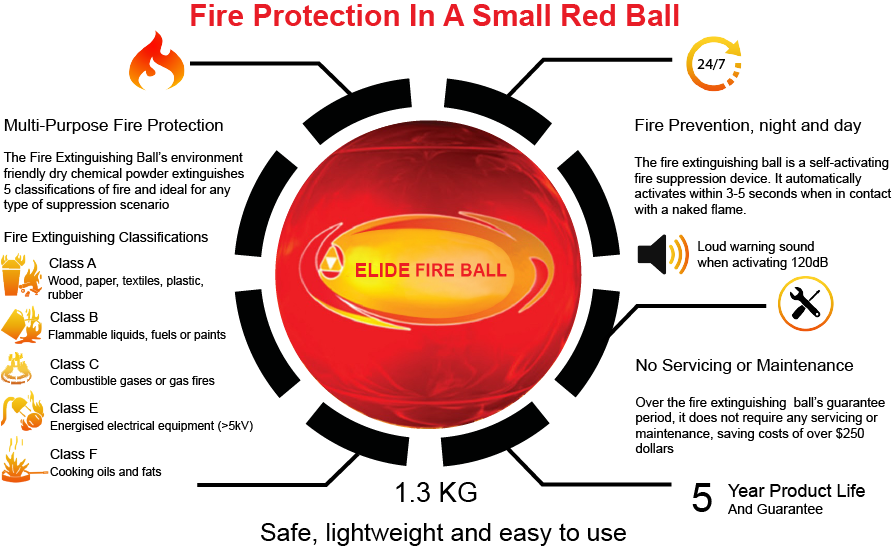The Elide Fire Ball is a new innovative fire suppression technology, world’s first self-activating, un-attended and portable fire suppression ball.